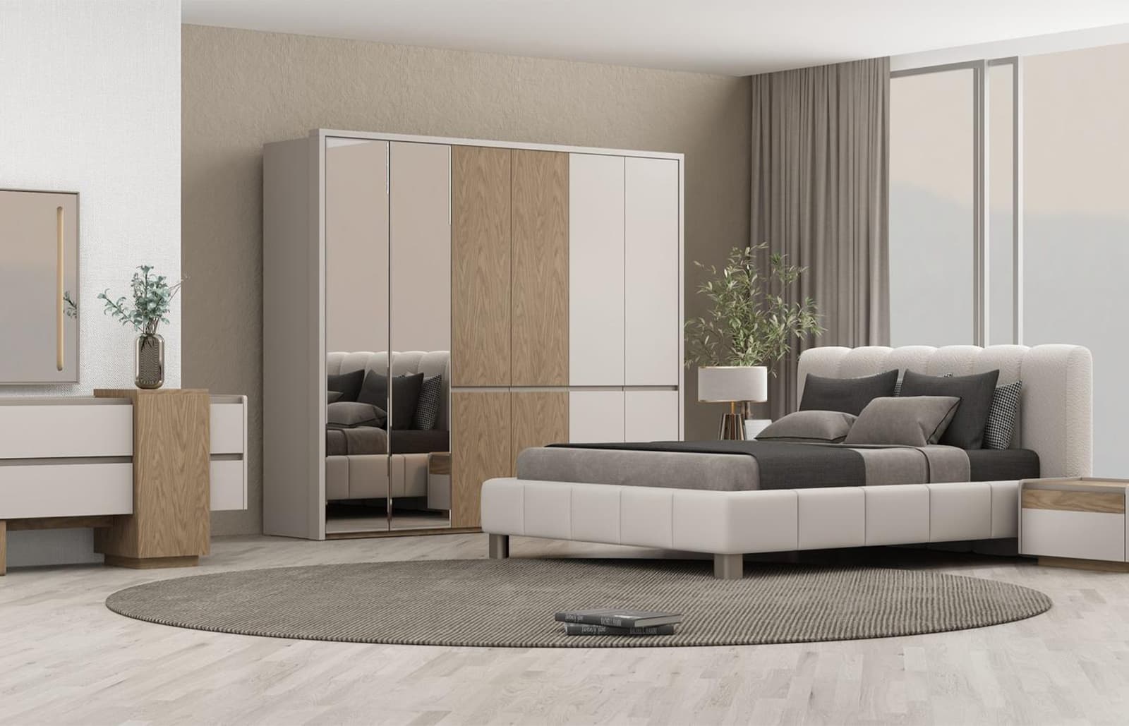 Setin bir parçası olarak sunulan gece dolapları, şık ve işlevsel depolama alanları sunar. Geniş çekmeceler, giysilerinizi ve diğer kişisel eşyalarınızı düzenli bir şekilde saklamanıza yardımcı olur. Aynalar, odanın daha geniş ve ferah görünmesini sağlarken, aynı zamanda odanın dekoratif unsurlarından biri olarak görev yapar.