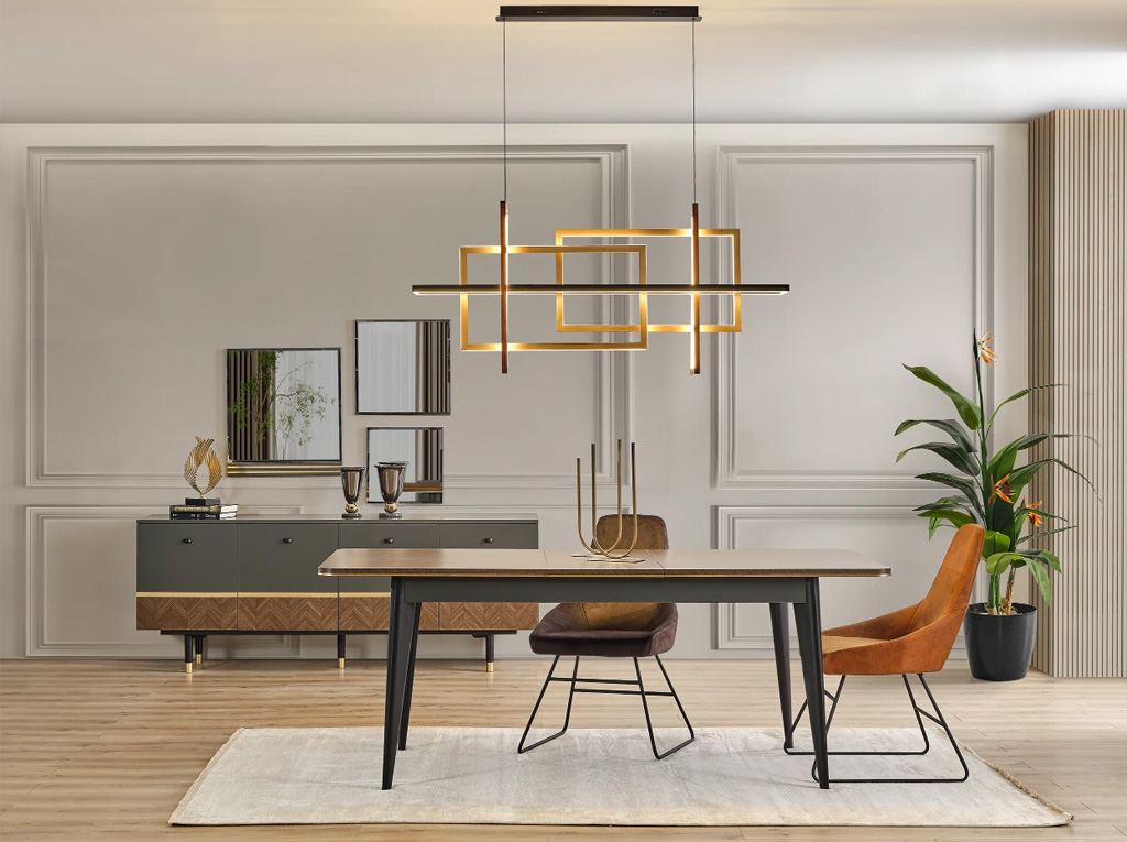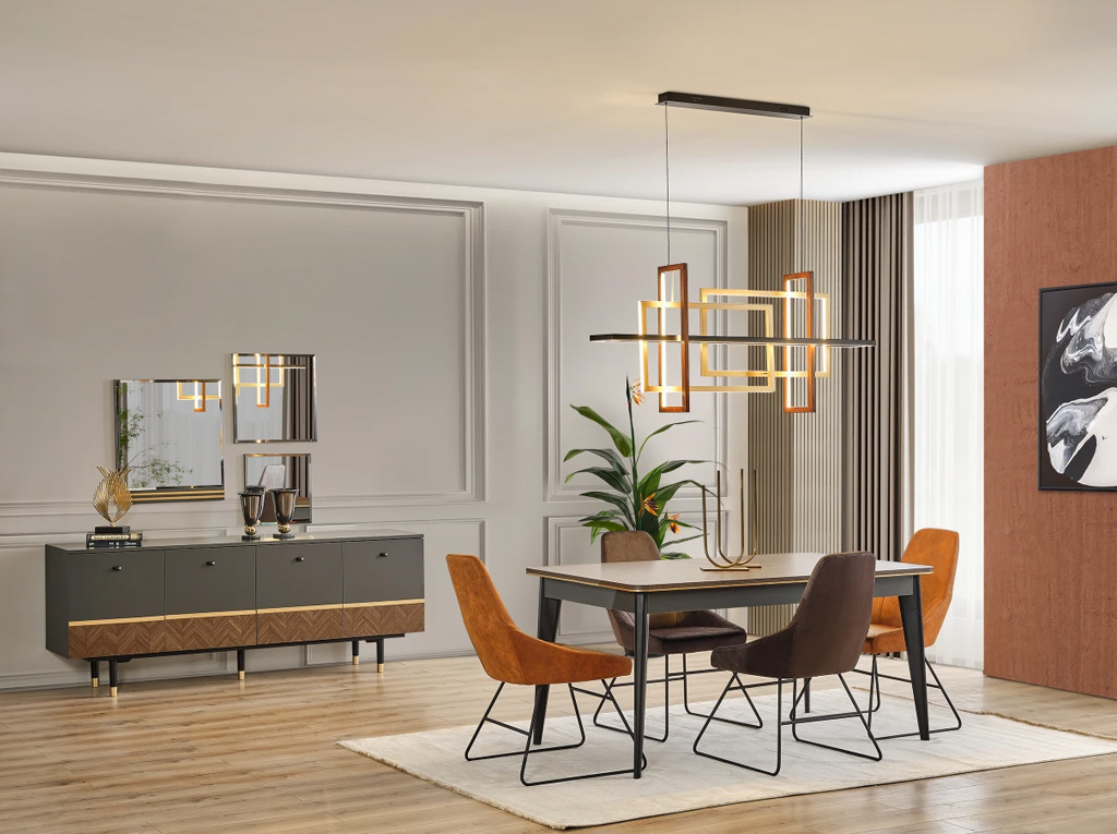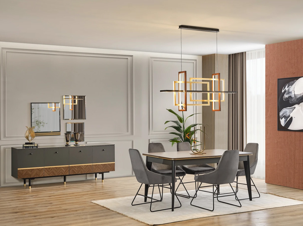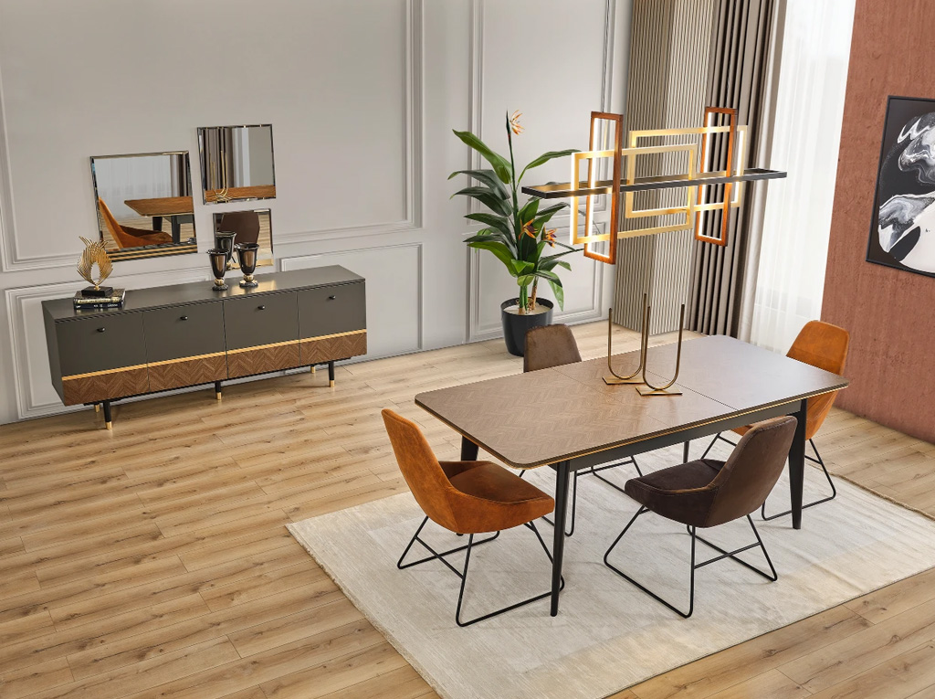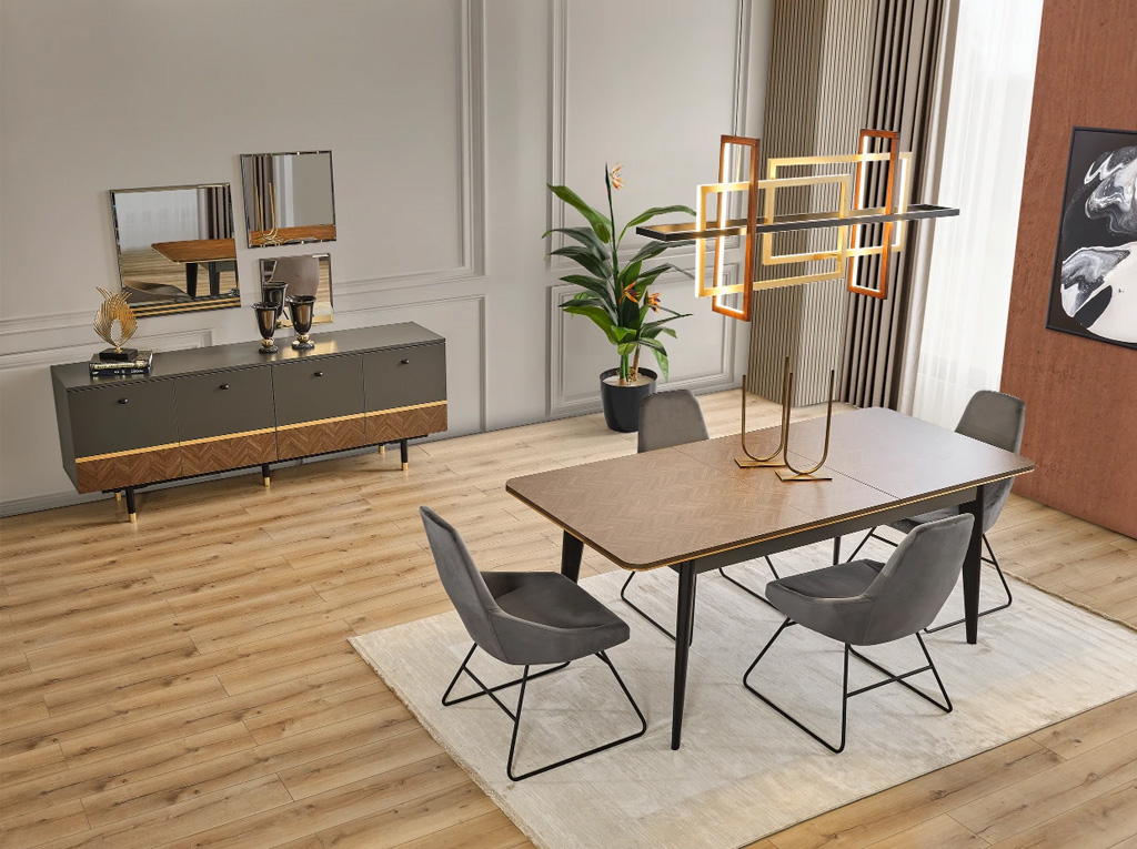 Yemek Odası Takımları 1 masa, 6 sandalye, 1 aynalı konsol, 1 TV Ünitesinde oluşup her ürün opsiyoneldir