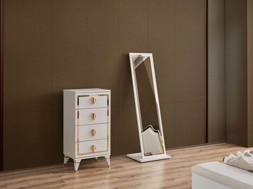 İnci Yatak Odası'nın üretiminde kaliteli malzemeler kullanılmaktadır. Dayanıklı ahşap çeşitleri, özenle seçilen kaplamalar ve sağlam bağlantı elemanları, takımın uzun ömürlü olmasını sağlamaktadır. Ayrıca, sağlık standartlarına uygun boyalar ve vernikler kullanılarak, kullanıcıların sağlığını korumak ön planda tutulmuştur.