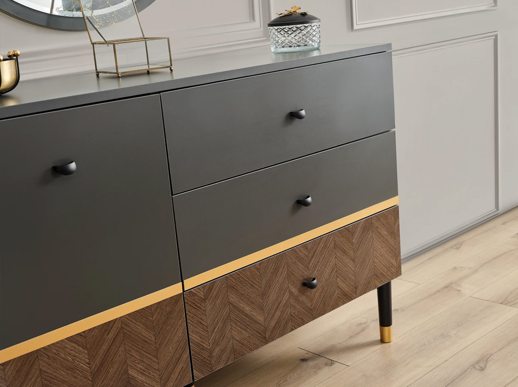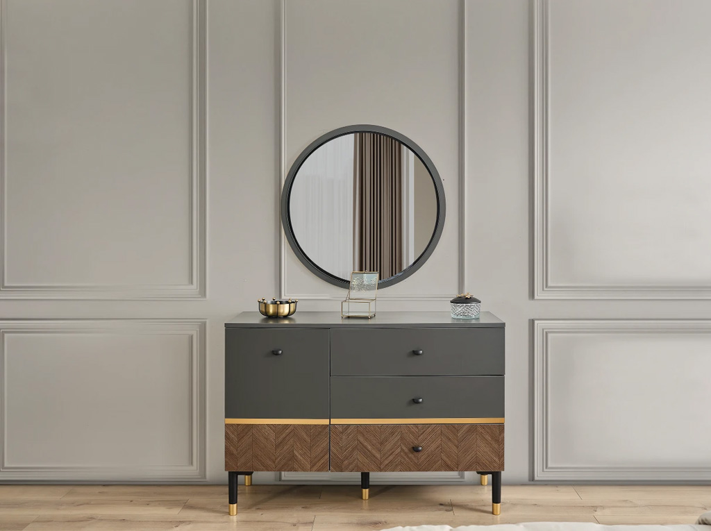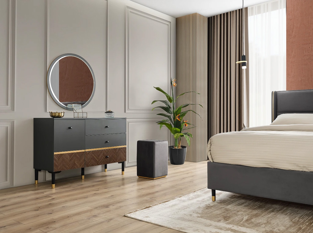 Yatak odasının diğer önemli parçaları arasında şık bir dolap, geniş bir şifonyer ve şık bir komidin bulunur. Dolap, kıyafetlerinizi düzenli bir şekilde saklamak için geniş iç hacme sahiptir. Şifonyer ise geniş çekmeceleriyle eşyalarınızı düzenlemenizi kolaylaştırırken, zarif tasarımıyla odanıza şıklık katar. Komidin ise yatağınızın yanında bulunarak kullanışlı bir depolama alanı sunar.
