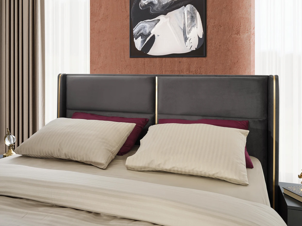 Defne Yatak Odası'nın ana özelliği, minimalist çizgileri ve zarif detaylarıyla dikkat çeken yatak başlığıdır. Bu başlık, odanın merkezinde yer alır ve hemen göze çarpar. Yumuşak dokulu kumaşıyla lüks bir görünüm sunan başlık, dinlenme alanınıza sofistike bir hava katmaktadır.