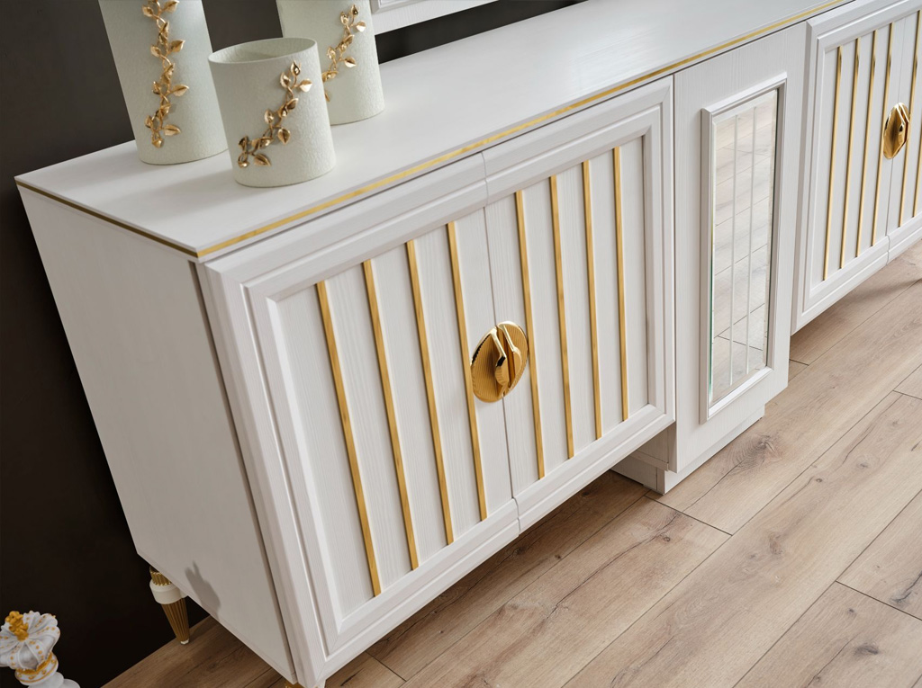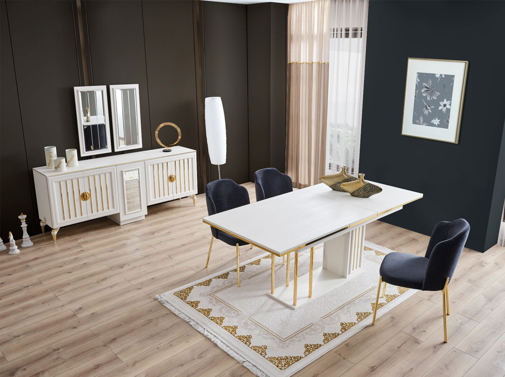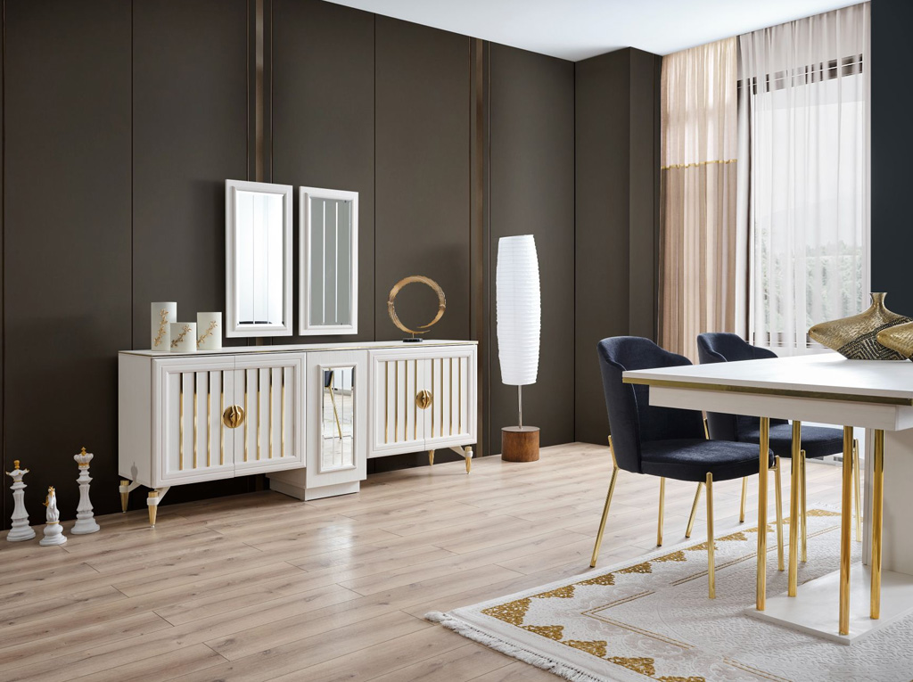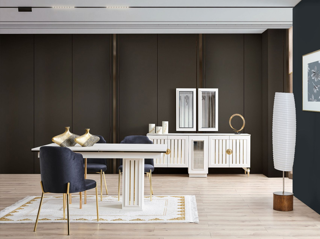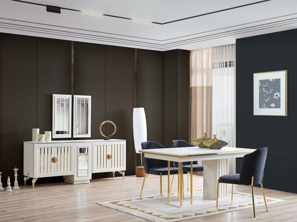 Yemek Odası Takımları Ürün 1 masa, 6 sandalye, 1 aynalı konsol, 1 TV ünitesinden oluşup her ürün opsiyoneldir.