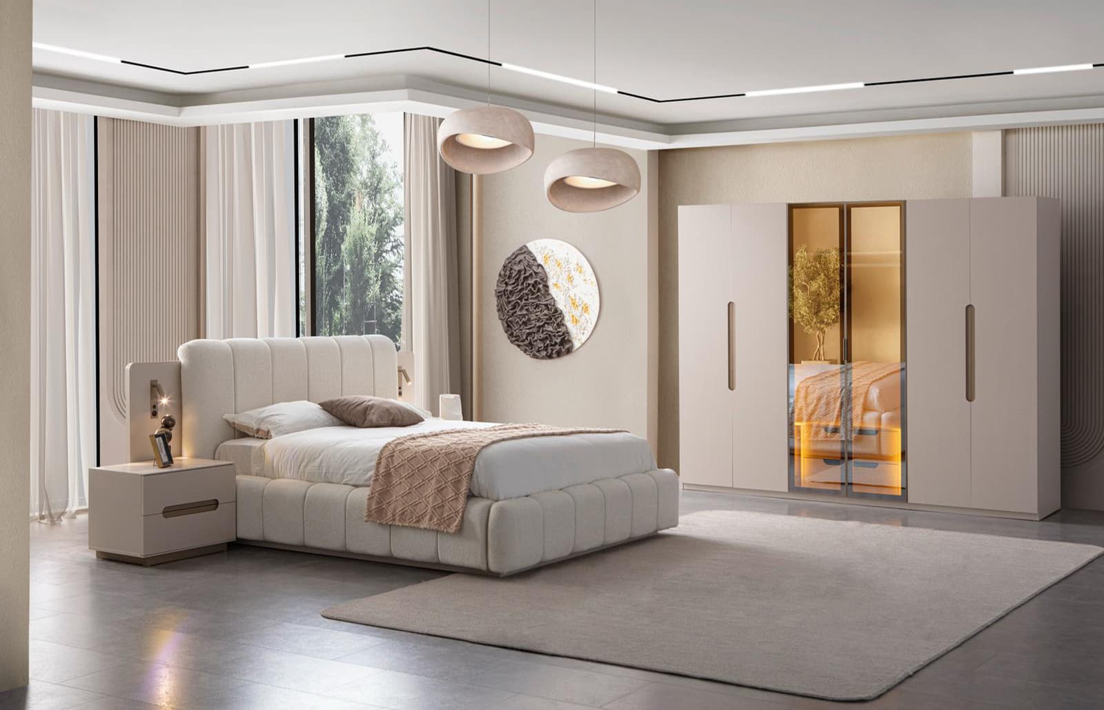 Nirvana Yatak Odası, konfor ve zarafeti bir araya getiren modern bir tasarıma sahip, dinlendirici ve rahatlatıcı bir mekandır. Bu benzersiz yatak odası seti, lüks ve stil arayan herkes için mükemmel bir seçenektir.