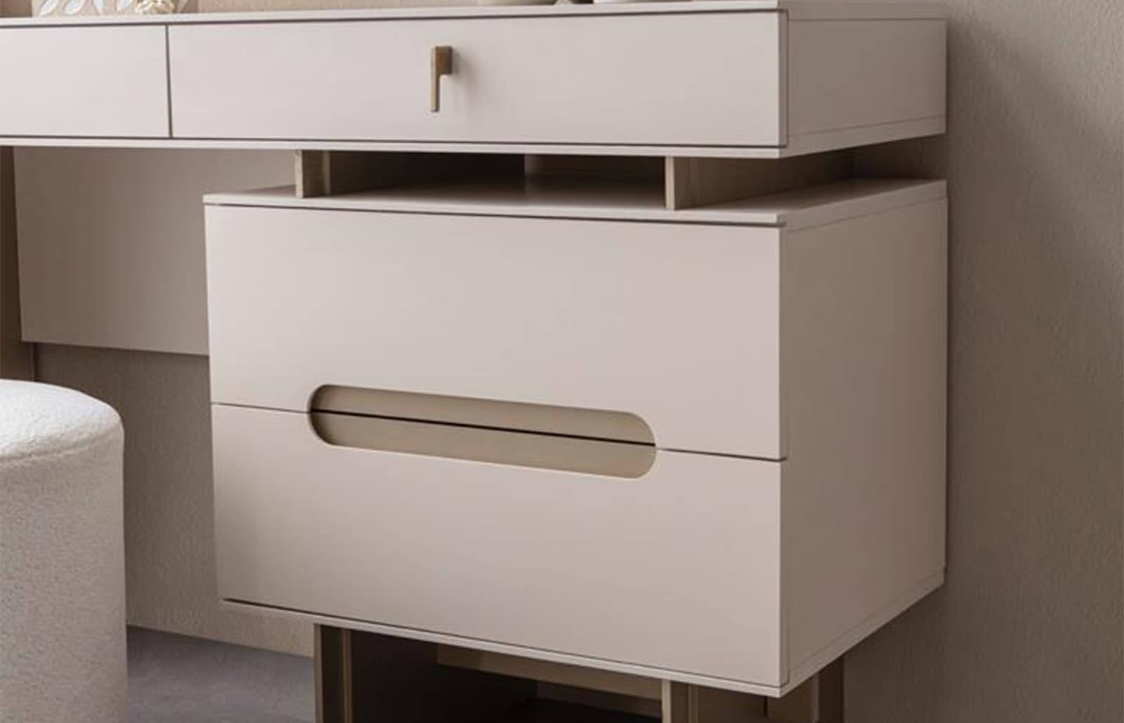 Bu yatak odası setindeki detaylara dikkat çekmek gerekirse, bir ayna, şık bir makyaj masası ve ergonomik bir çalışma masası gibi ekstra öğeler bulunur. Ayrıca, rahatlatıcı bir atmosfer yaratmak için hafif bir bitki veya çiçek düzenlemesiyle odanın dekorasyonunu tamamlayabilirsiniz.